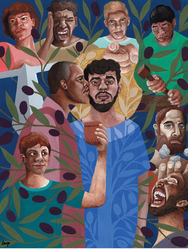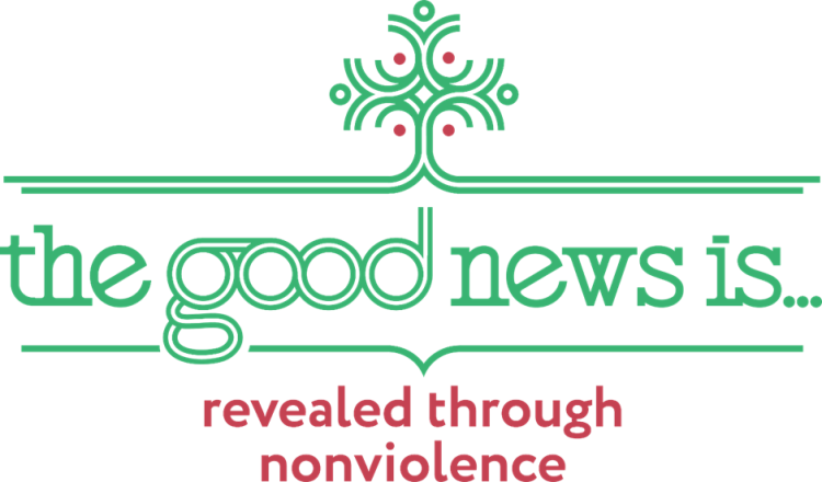 At the heart of this image is Jesus, looking at us. His halo shines revealing the many faces of violence surrounding him. From the foundation of Jesus’ steady posture grows an olive tree. Its branches extend beyond his clothes, reaching out to embrace those around him. Through his nonviolent stance, the truth of a violent world is revealed. In that truth, the good news of peace finds soil in which to take root, to grow and to flourish.